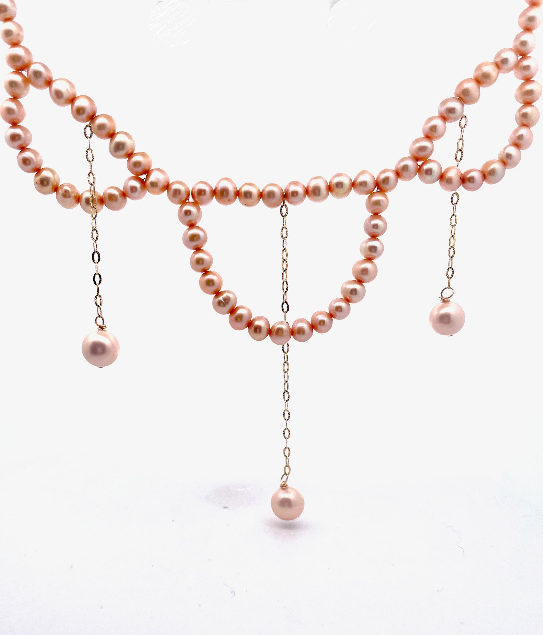 This unique piece is styled after the Victorian days of old.  Romantic, Sexy, Unique.  Mother of Pearl delightfully dangles from 18K vermeil change suspended in pink pearls. 22 inches.