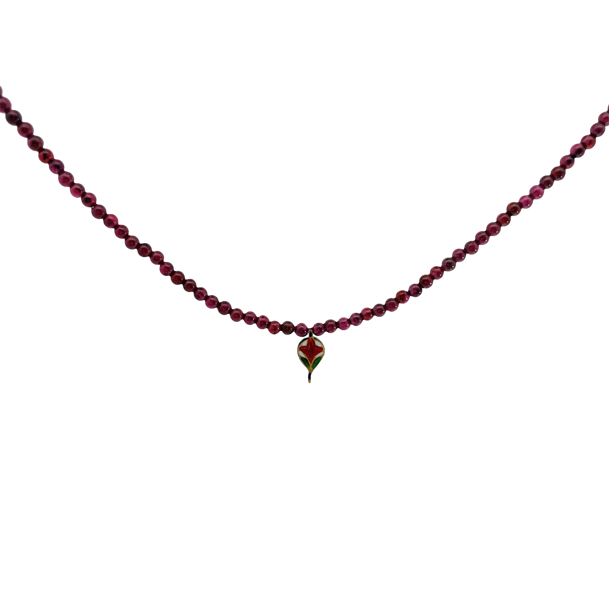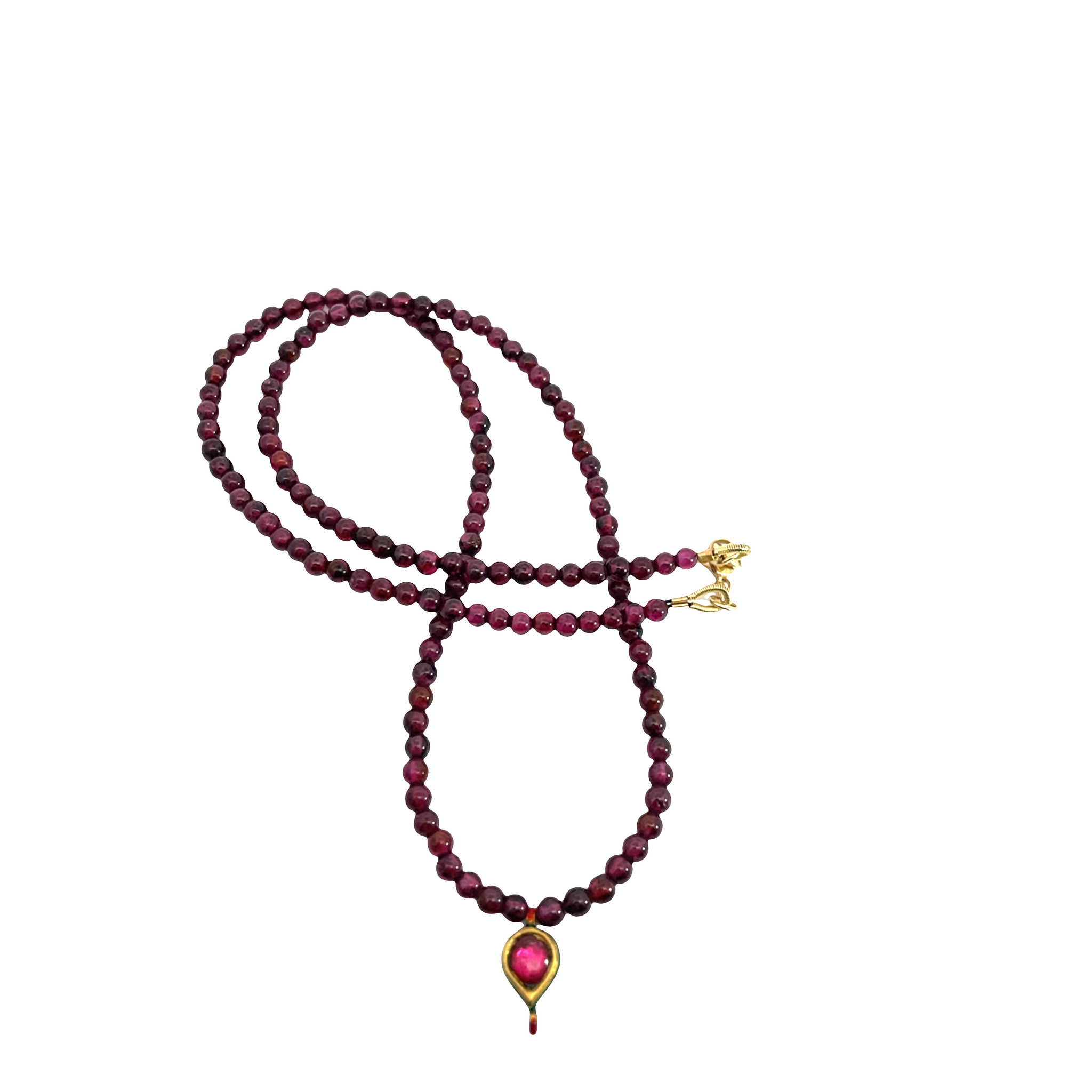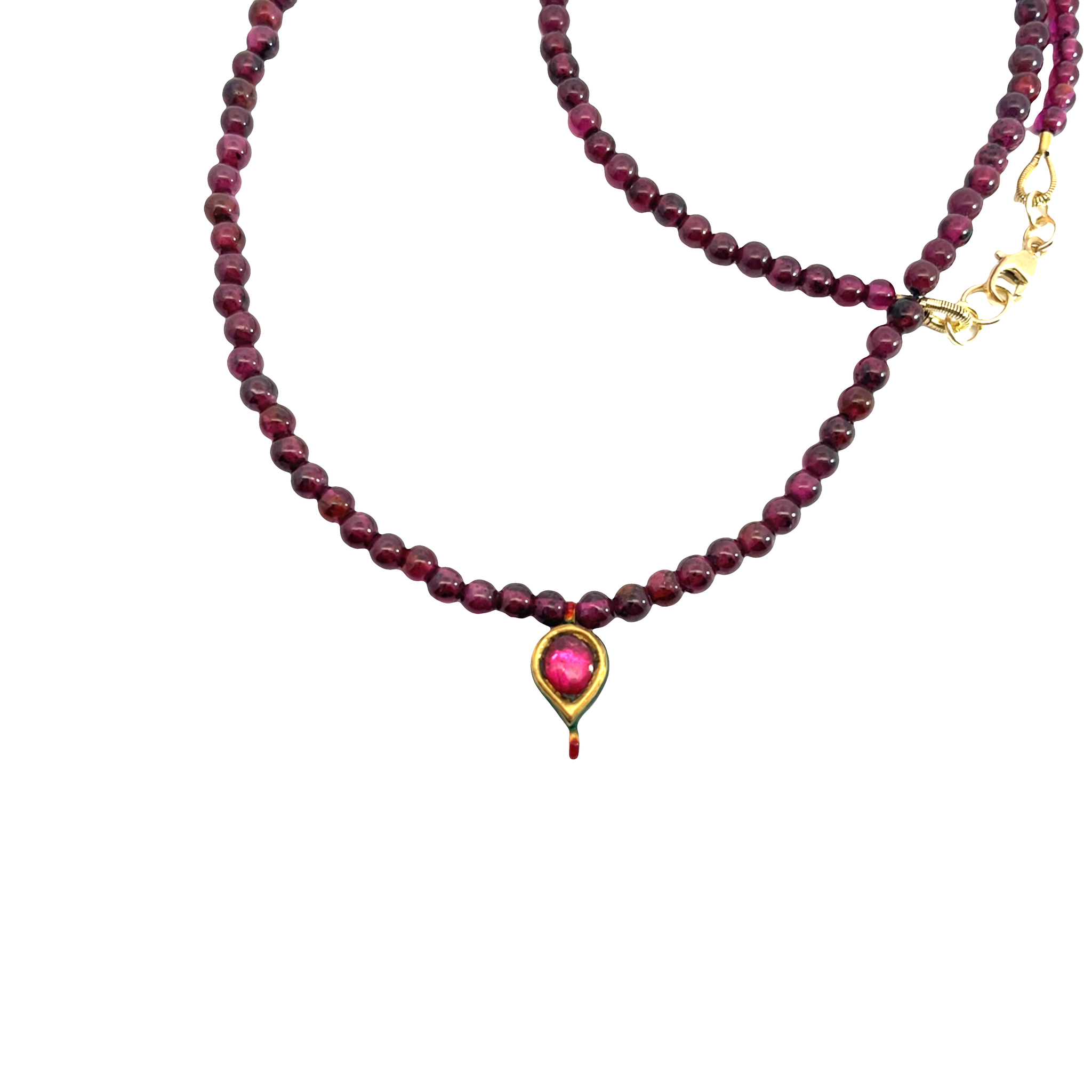 A deep garnet strand paired with a petite Antique 18k gold reversible charm set with a single ruby on one side and Meenakari enamel on the other.